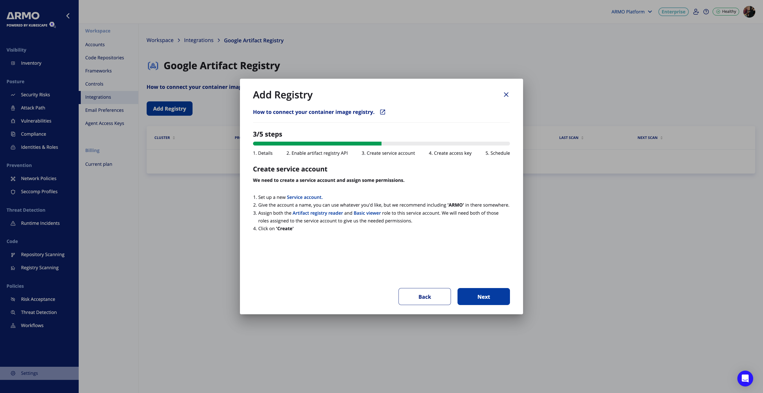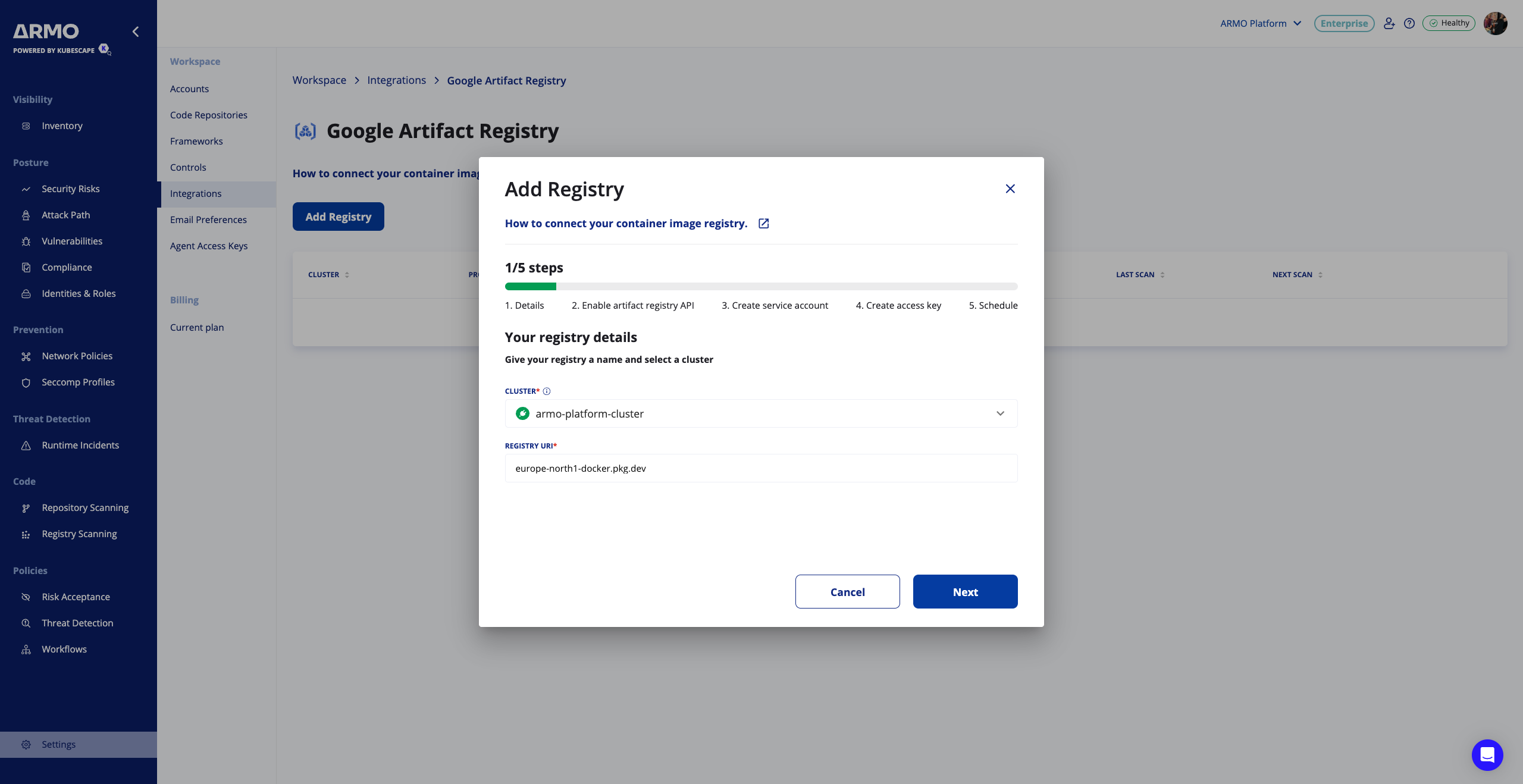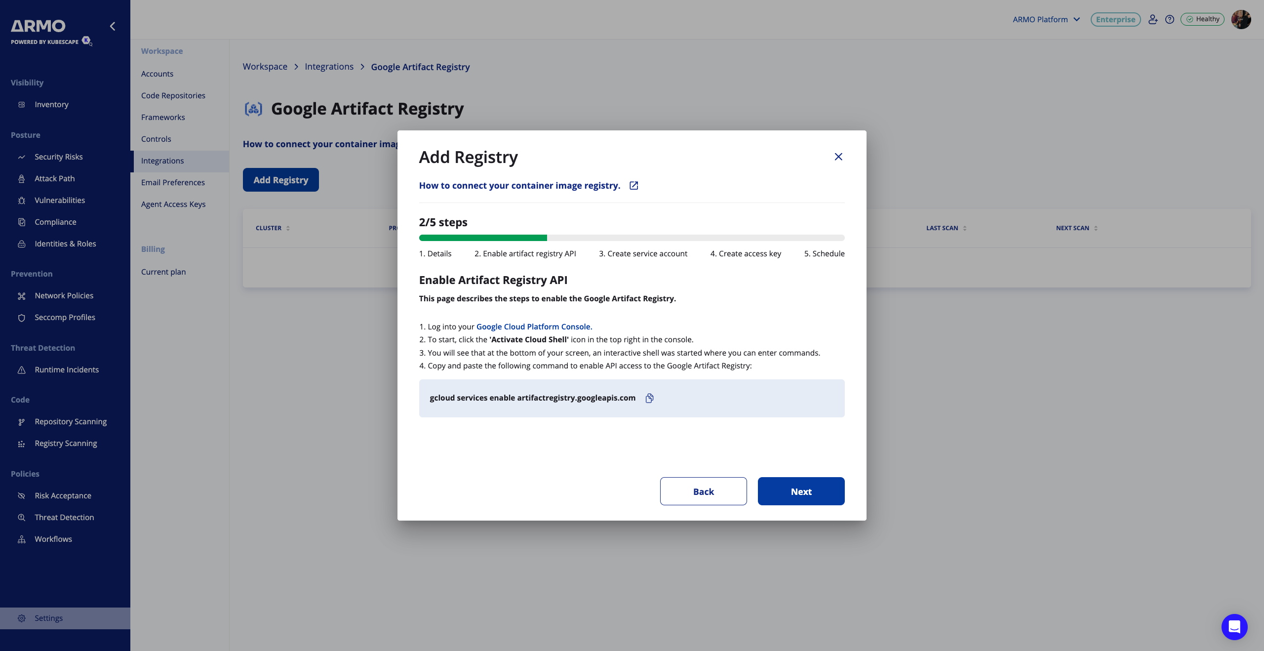 Follow the on-screen instructions to enable the Artifact Registry API in your Google Cloud Console. This ensures ARMO has access to your container images.