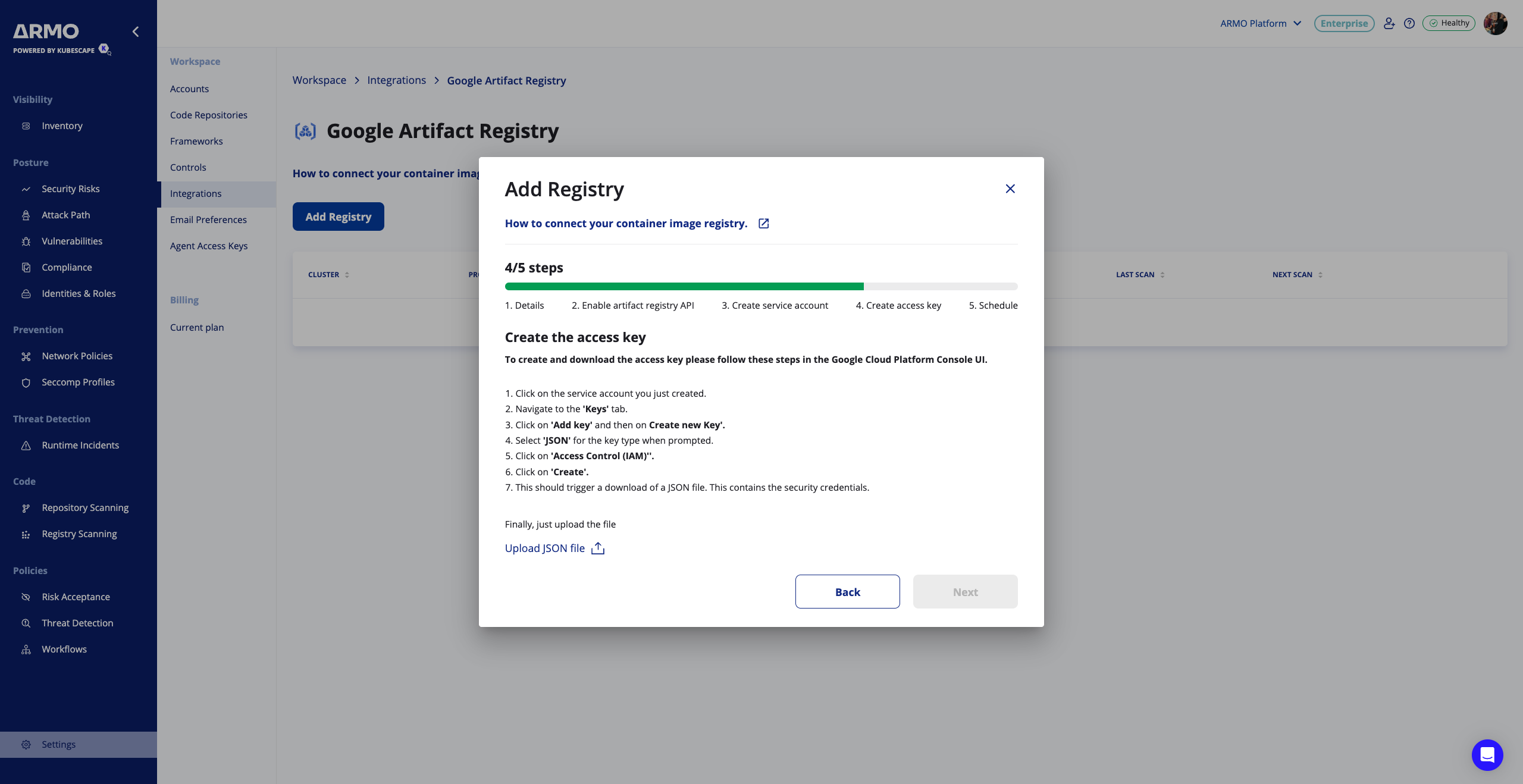 Upload the downloaded JSON file into the ARMO platform to authenticate the connection.