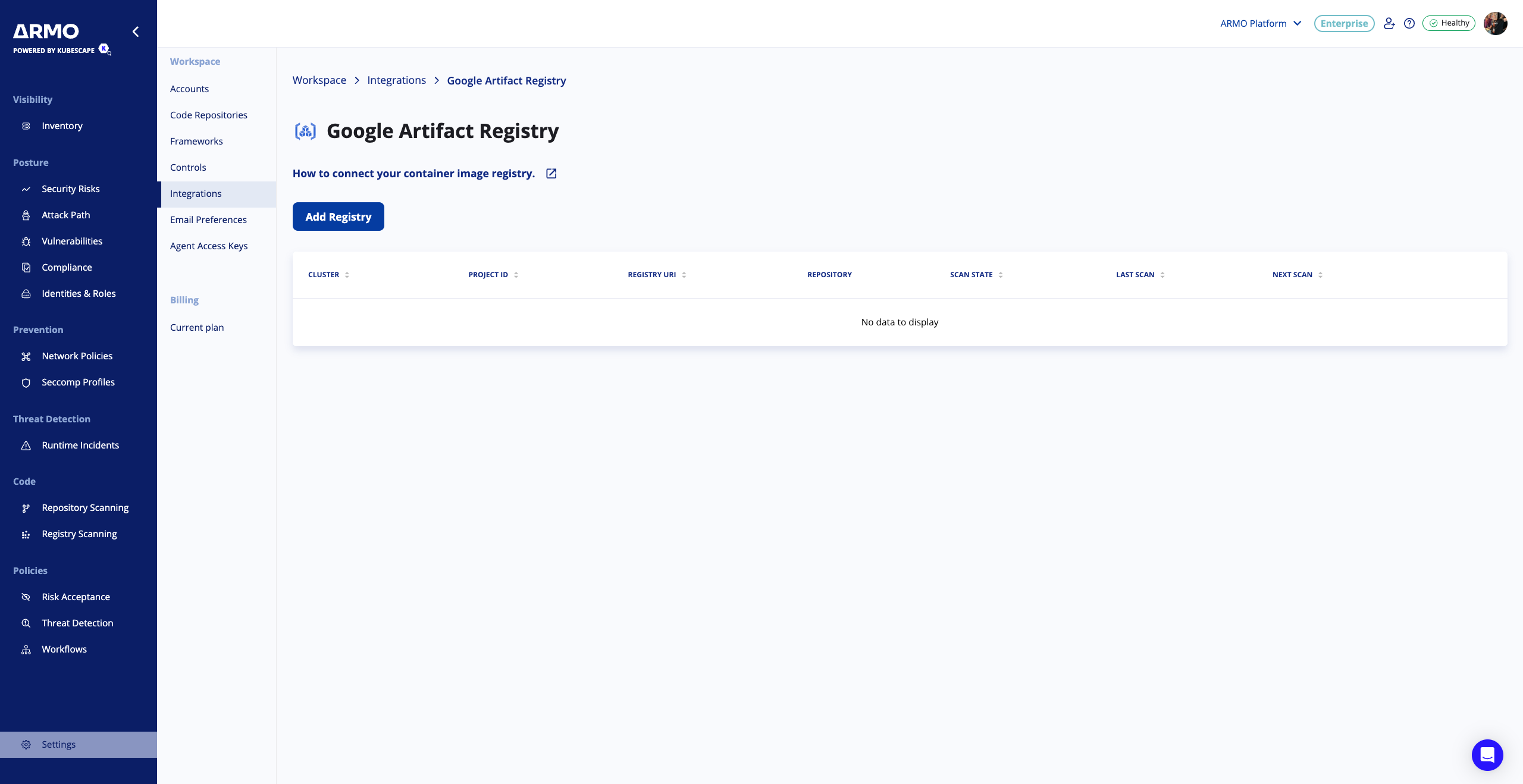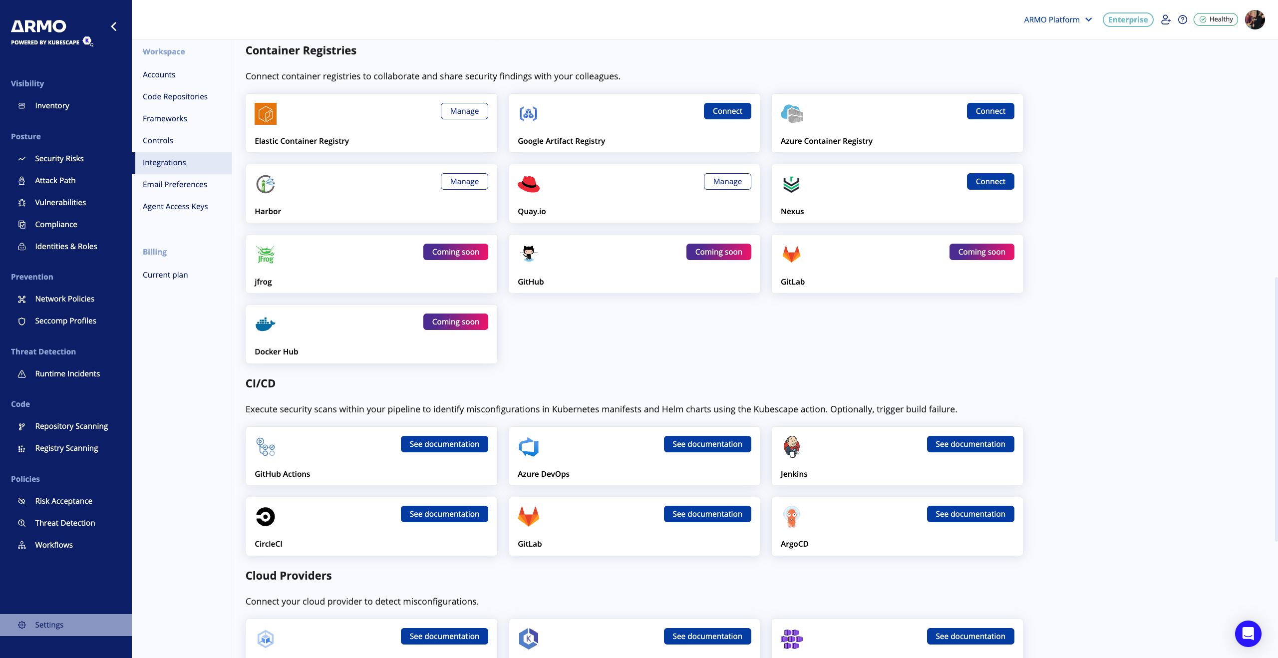 Log into the ARMO platform and navigate to the Integrations section from the settings menu.