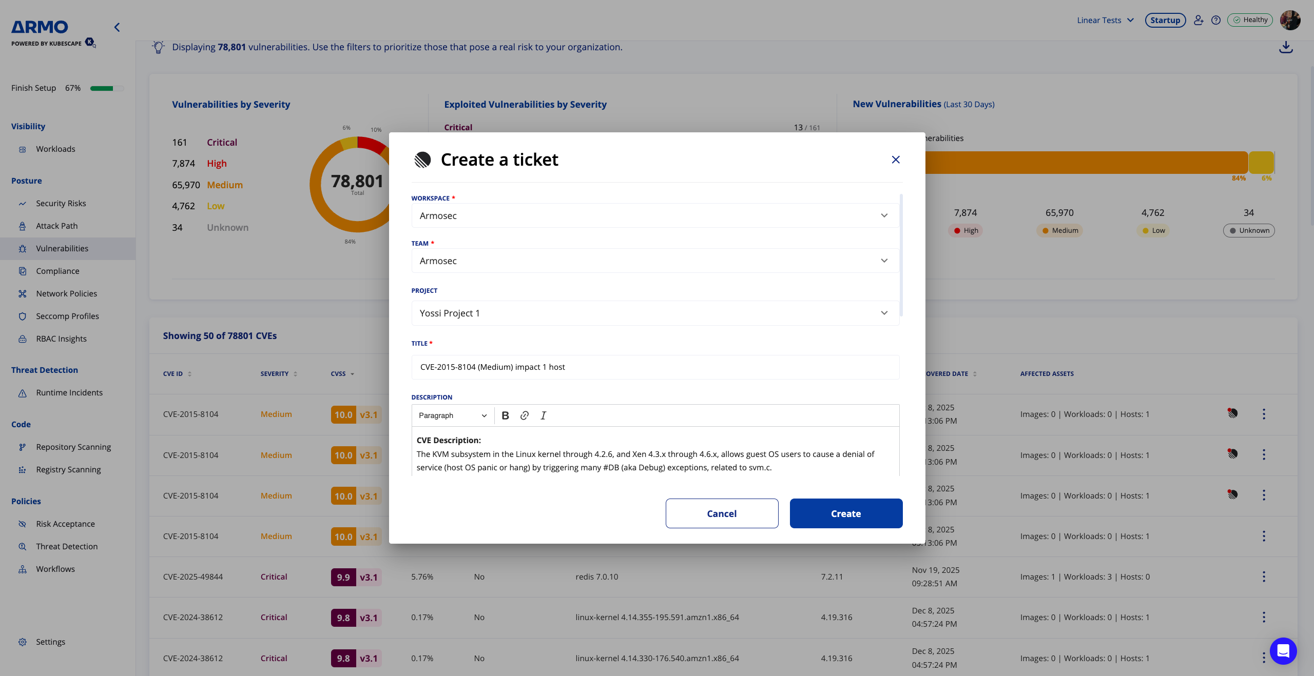 By enabling this integration, ARMO will create Linear issues for selected security issues, enriched with context such as affected assets, risk factors, attack details, and remediation guidance.
