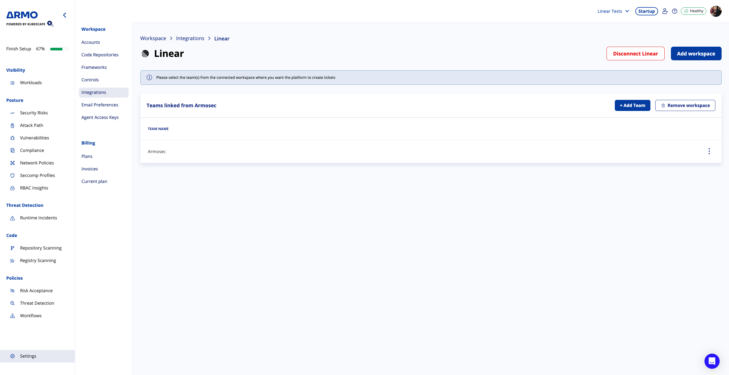 - Navigate to Integrations → Linear Settings Open your Linear integration configuration in the ARMO Platform.