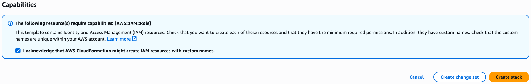 Scroll to the bottom and Mark the «I acknowledge that AWS CloudFormation might create IAM resources with custom names»