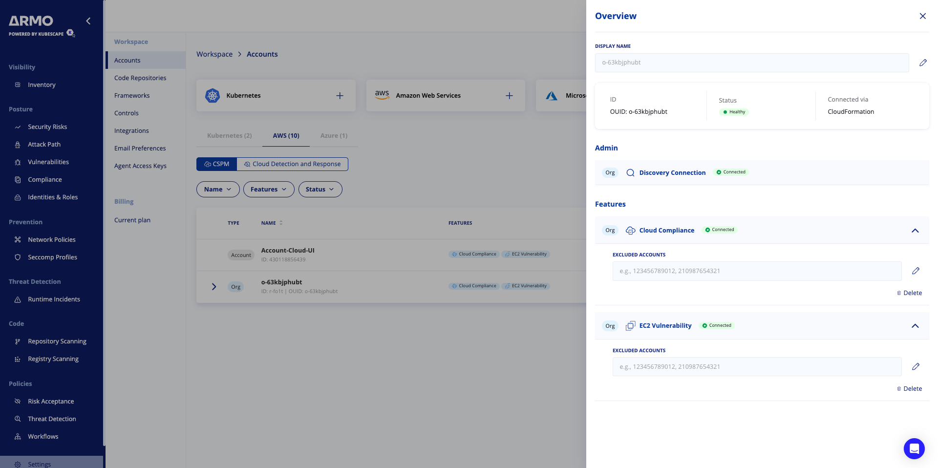 - In ARMO, verify that all accounts under the AWS Organization appear in the Settings / Accounts / AWS table.