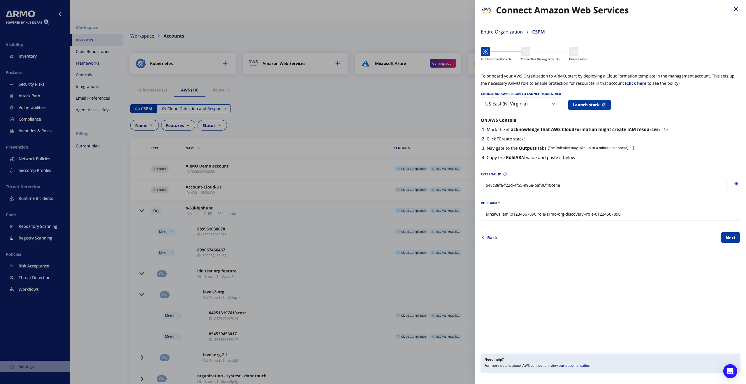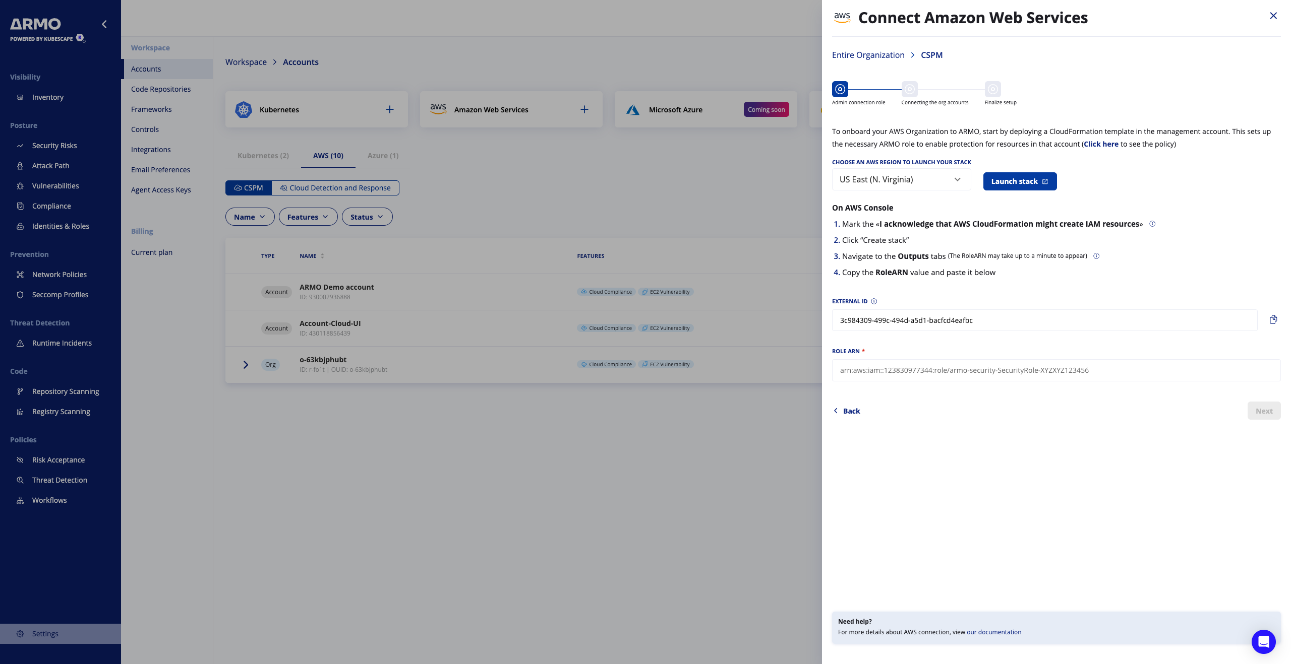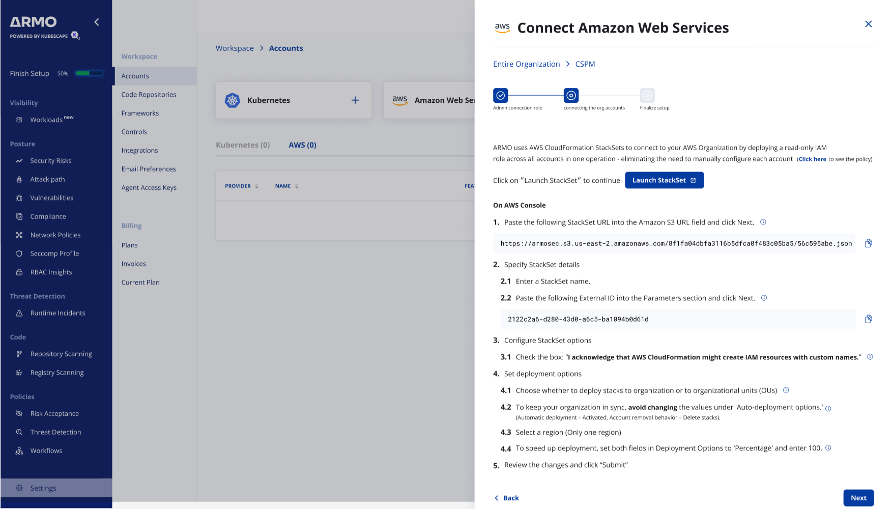 Back in ARMO, Click on ״Launch StackSet״ to continue and follow the steps on the ARMO connection wizard