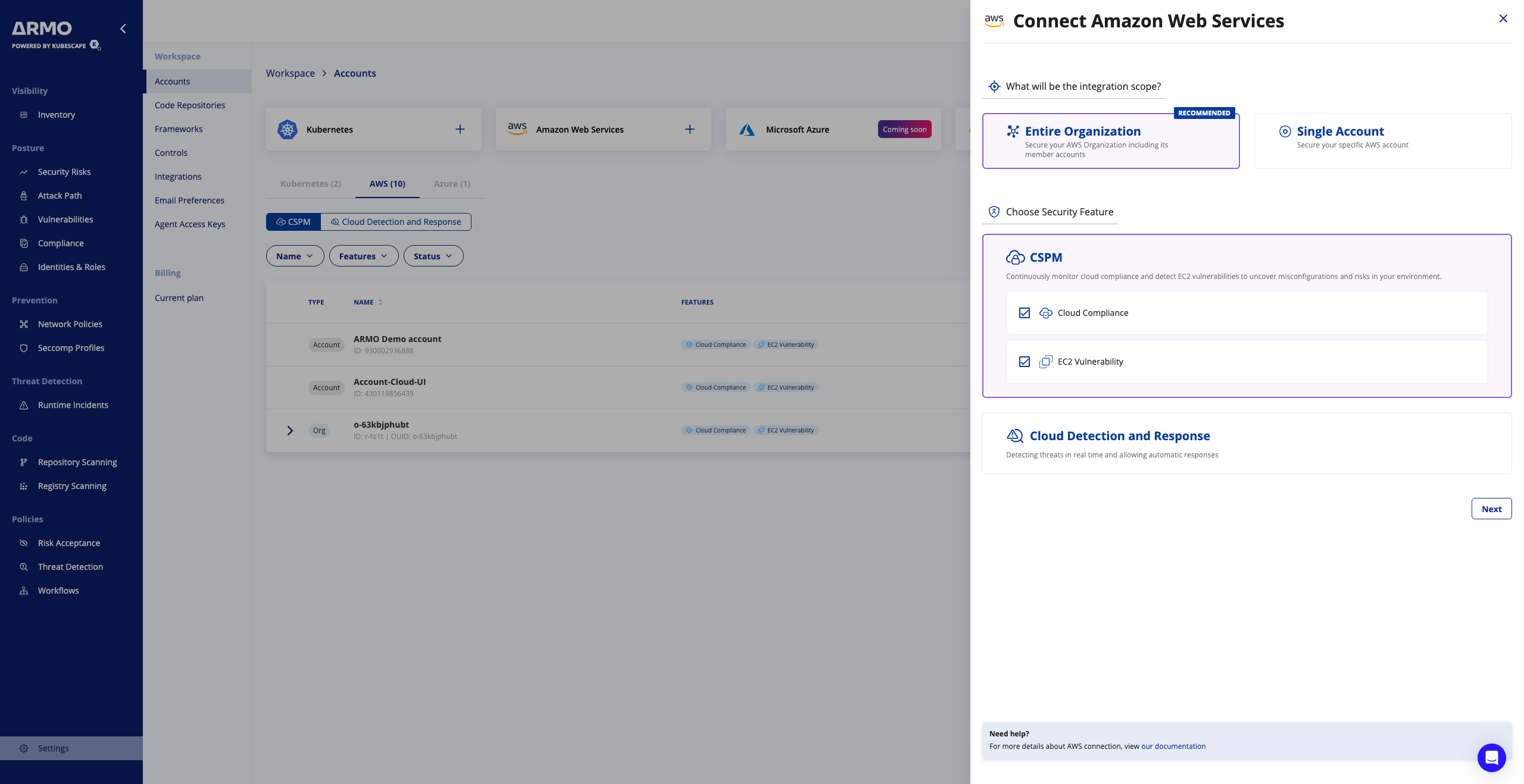 - In ARMO Platform: initiate the connect Amazon Web Services Organization flow.