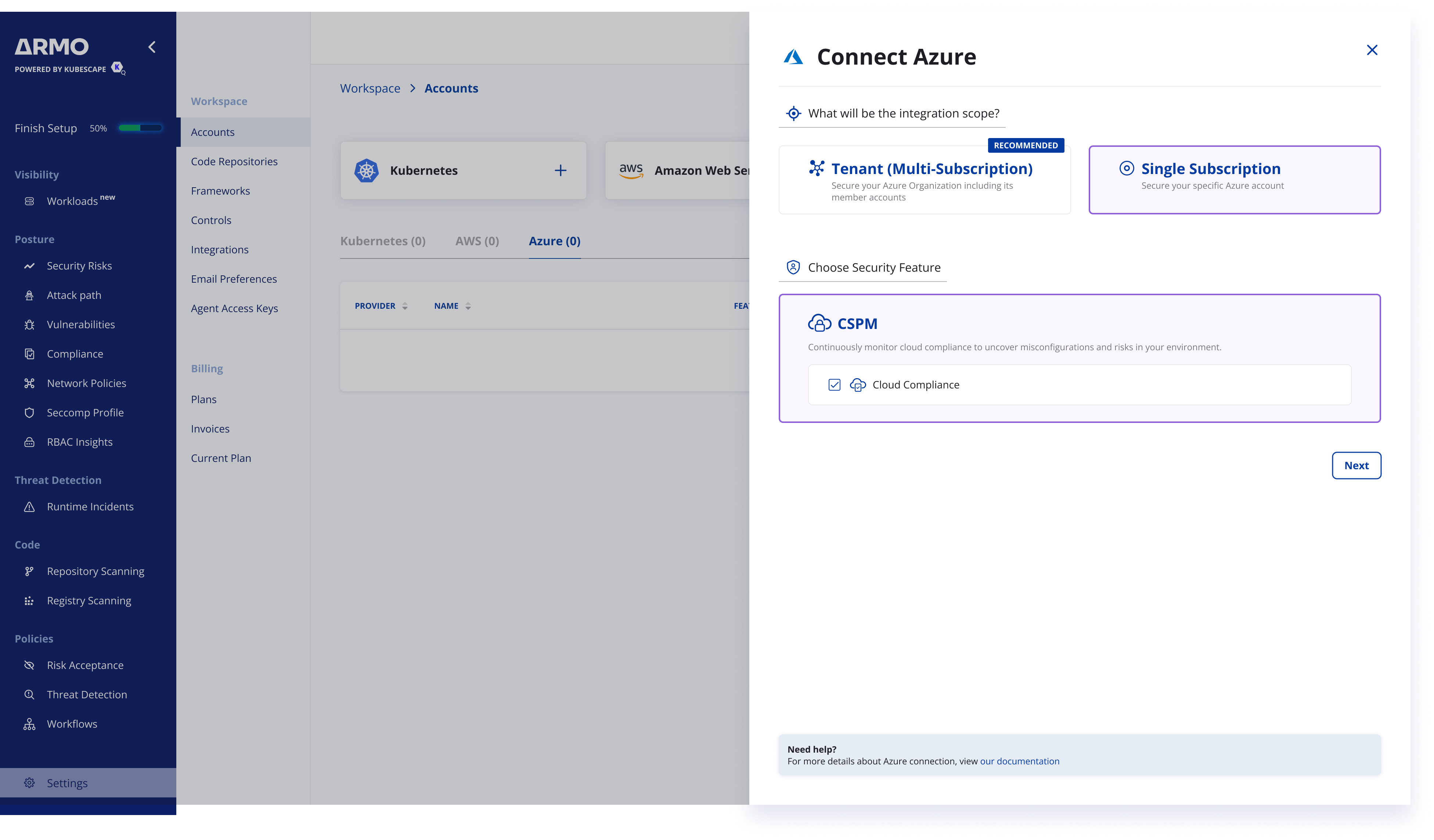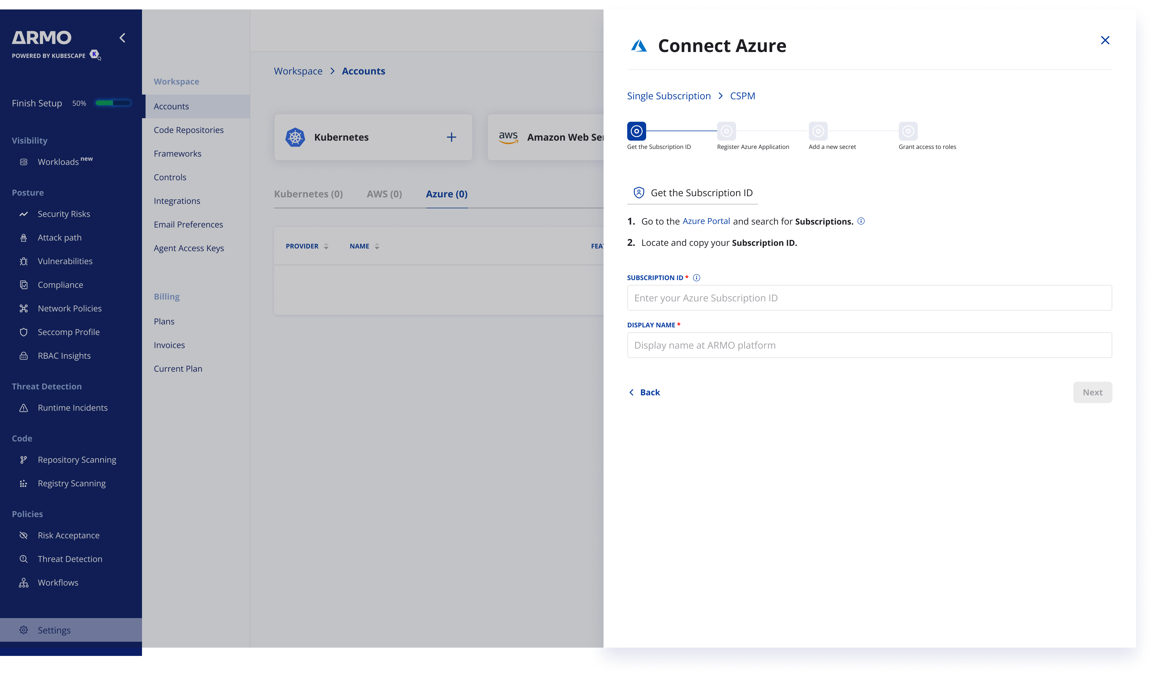 - Connected subscriptions appear under Settings → Accounts in the ARMO Platform.