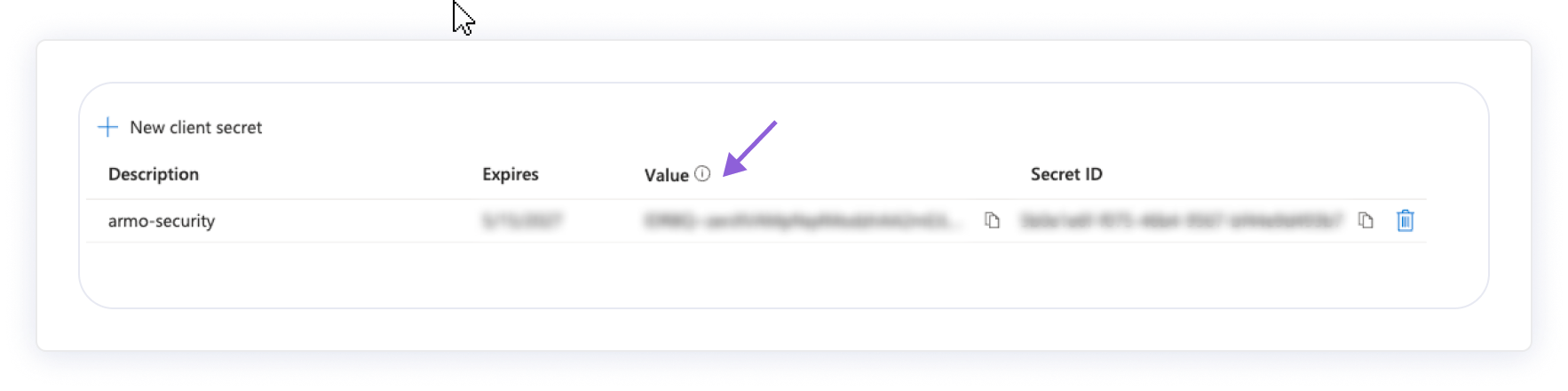 - Copy the Client ID, Tenant ID, and Secret Value — these are required to authenticate ARMO’s connection.