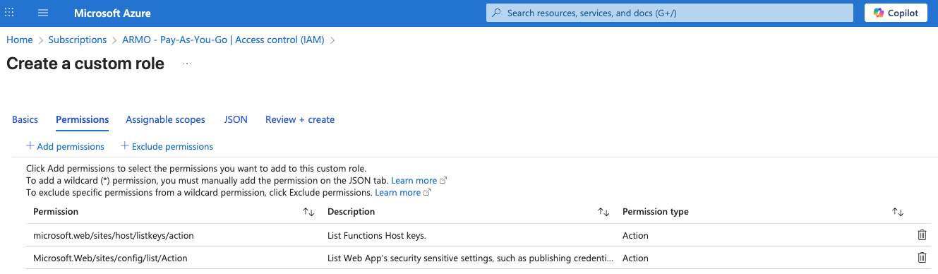 - Click Add permissions again and add: Microsoft.Web/sites/config/list/Action