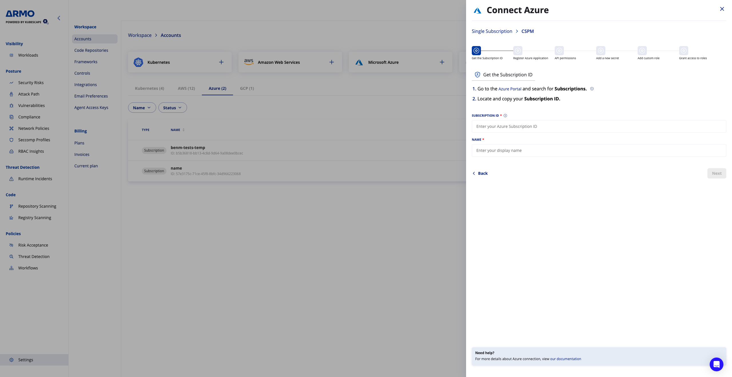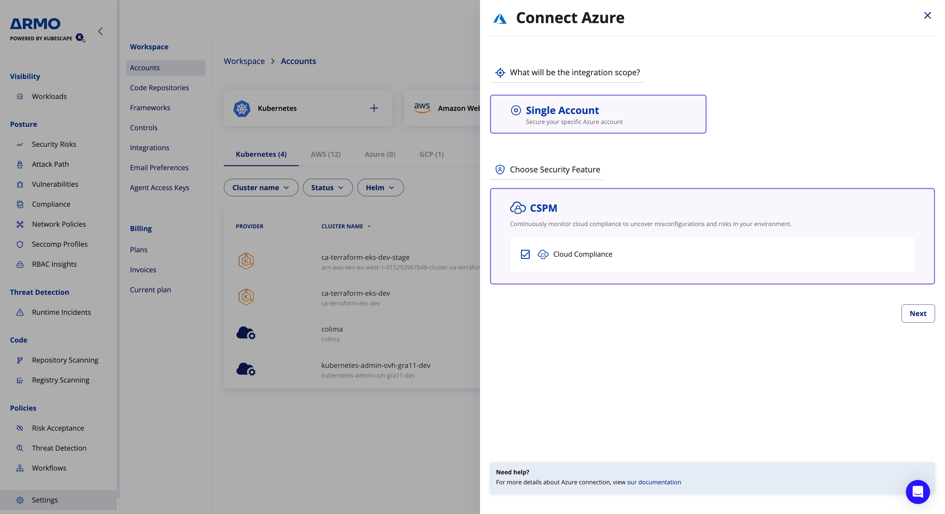 - Connected subscriptions appear under Settings → Accounts → Azure(tab) in the ARMO Platform.