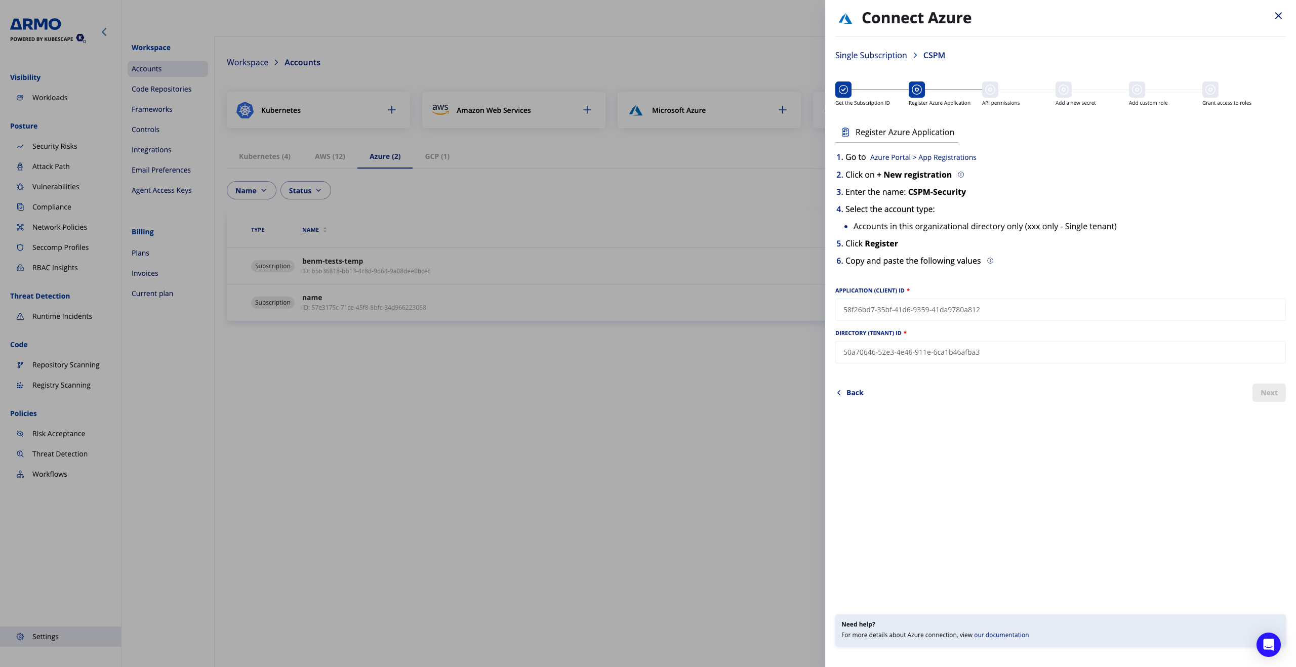 - Directory (tenant) ID and paste it in the ARMO connection wizard