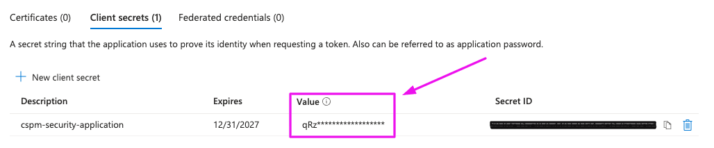 Client secret values cannot be viewed, except for immediately after creation. Be sure to save the secret when created before leaving the page.