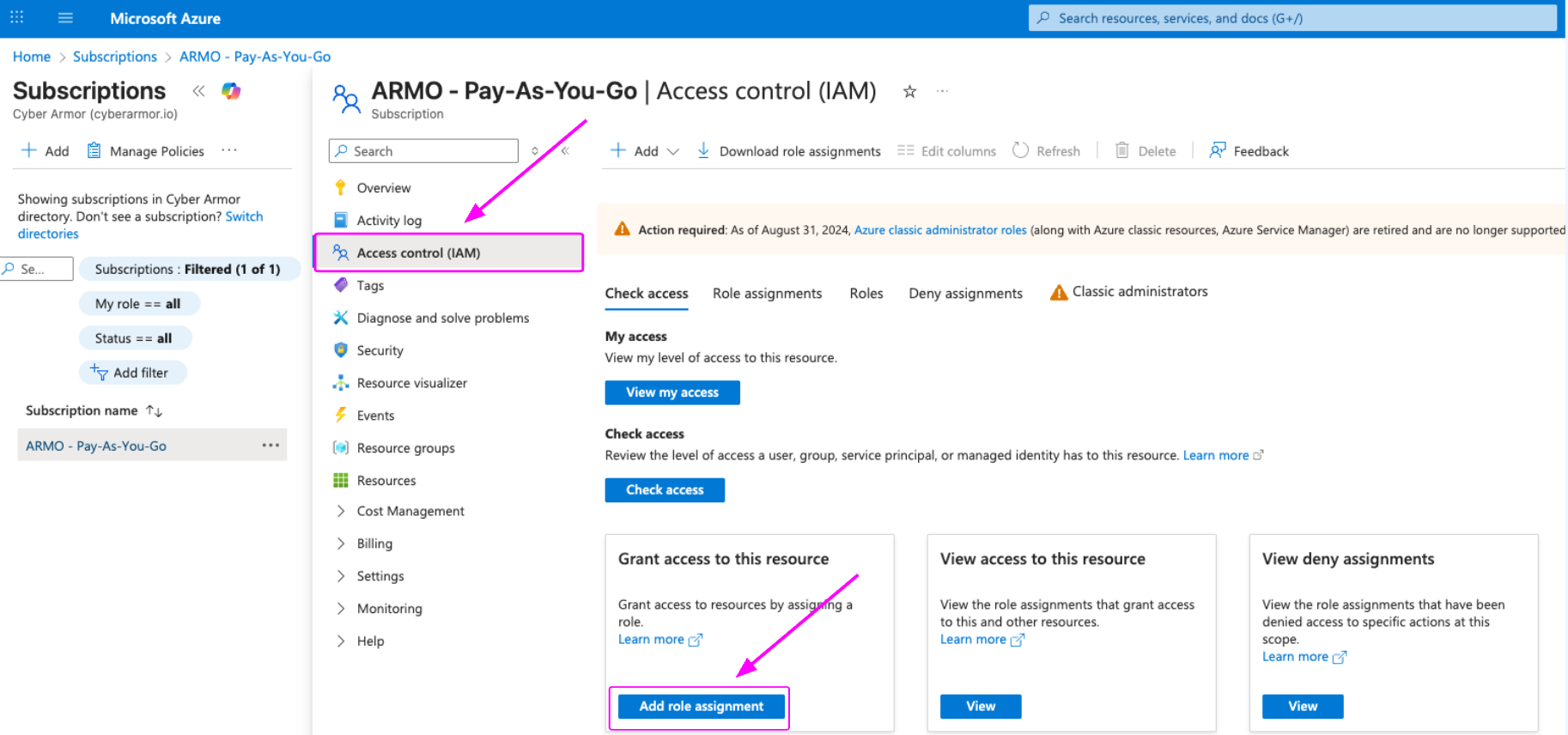 - In the target Azure Subscription, assign the ARMO application the Reader role under Access Control (IAM).