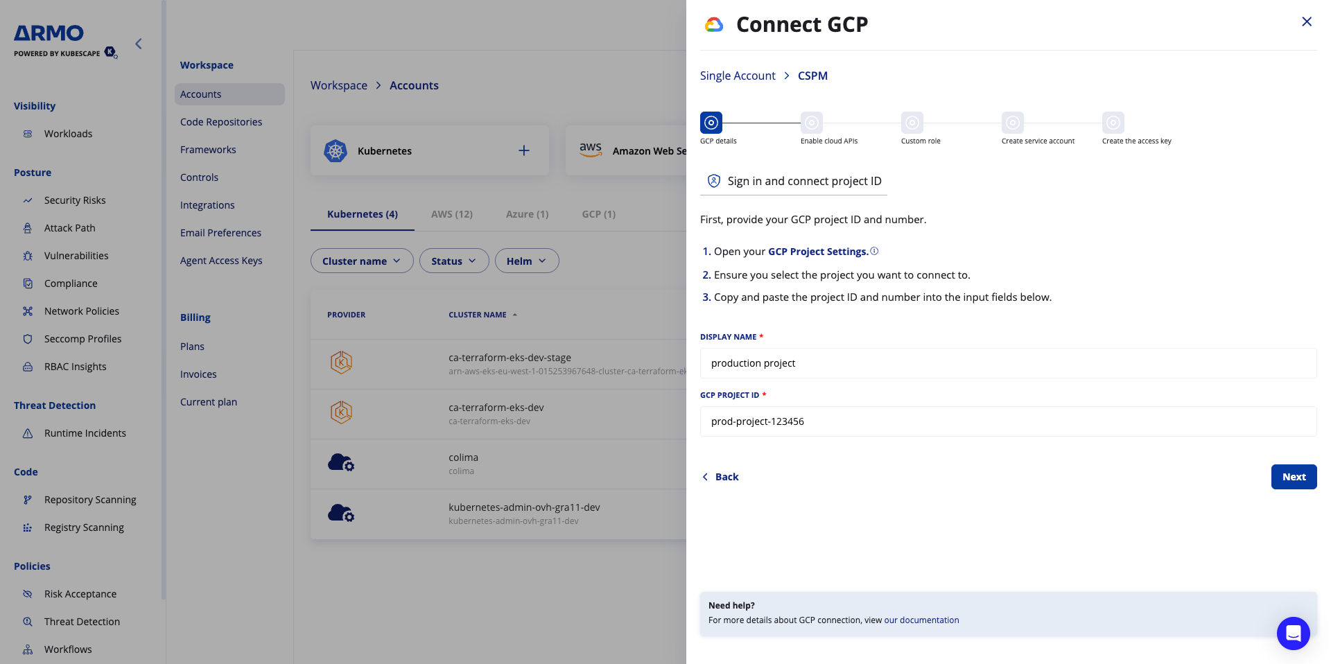 The GCP onboarding process in ARMO establishes secure, read-only access so ARMO can continuously analyze your cloud configuration, IAM posture, asset inventory, and audit logs.