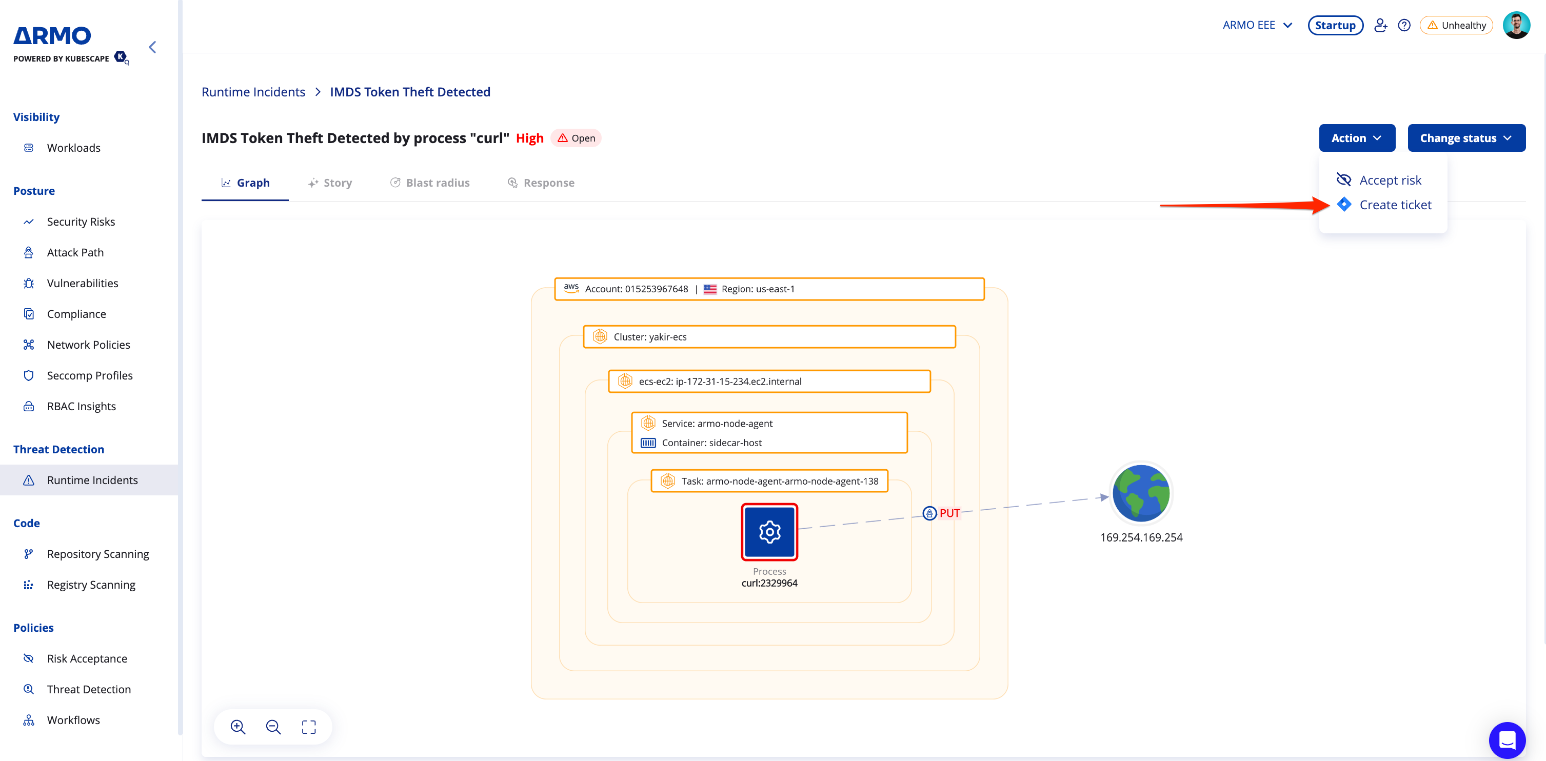 Tickets are pre-filled with relevant incident details and linked to the originating runtime incident in the ARMO Platform.